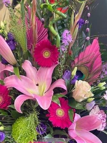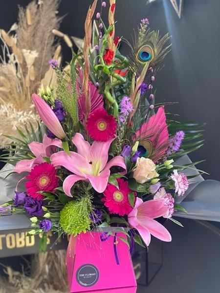 A bright mixture of seasonal flowers with dried spears and finished with peacock feathers. This is arranged in OASIS Floral Foam so will not need a vase or rearrangement