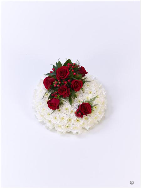A classic posy design created using a mass of white double spray chrysanthemums and completed with a spray of red roses, French ruscus and hypericum berries.