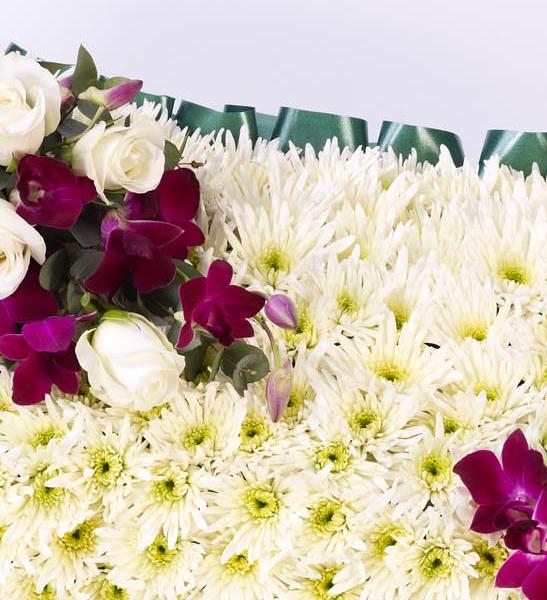 A classic 14" inch pillow-shaped design created using a mass of white double spray chrysanthemums and finished with a spray of white large-headed roses and purple dendrobium orchids.