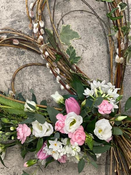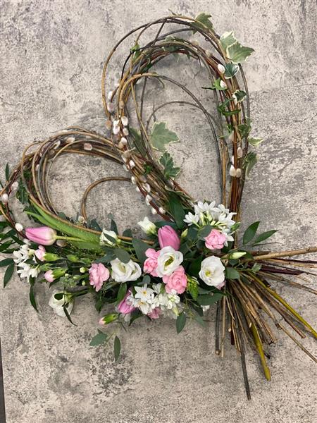 A hand woven heart made with Willow. Using OASIS fully biodegradable foam to ensure the spray of flowers have a water source. This is the perfect tribute for an eco burial with no plastic, a card with your message is attached with twine.