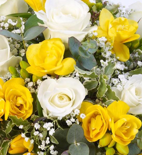 Roses and scented freesia in yellow and white are nestled amongst choice foliage in this classic posy design.