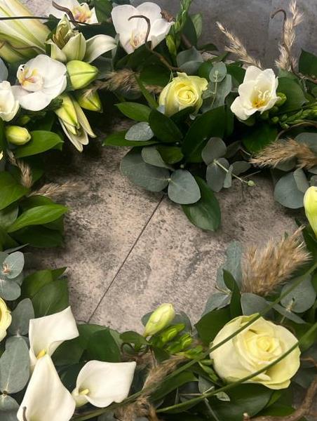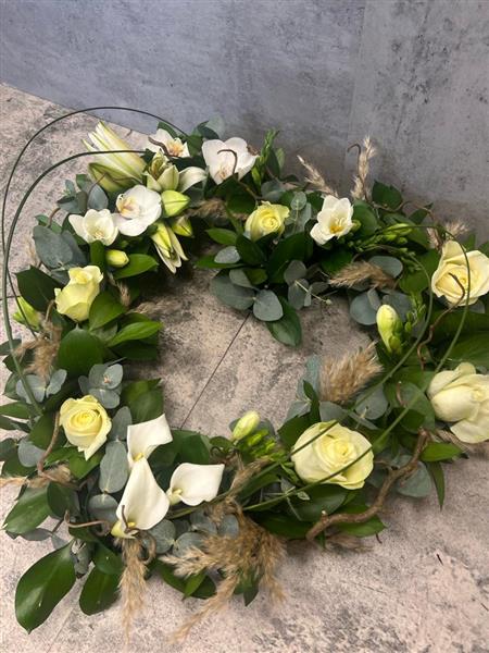 A stunning white and green themed heart tribute, With the finest quality of white and green flowers with a mixture of foliages, Including dried Pampas, Phalaenopsis Orchids and Roses.