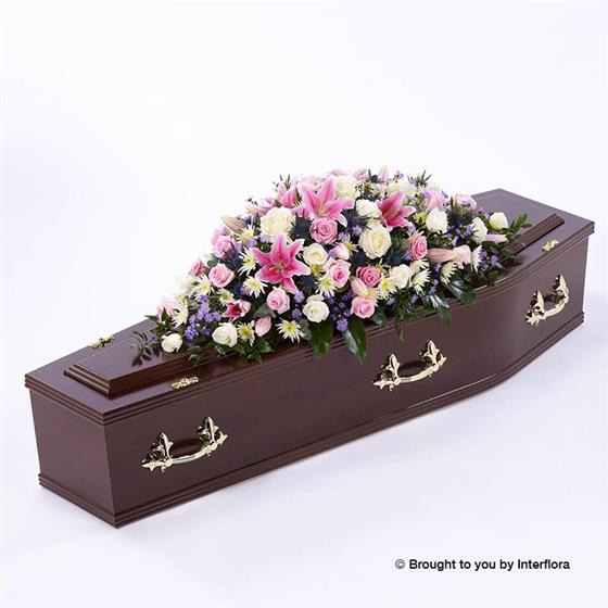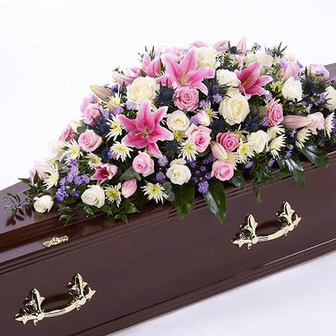 A selection of pink and white Rose are arranged with stunning pink Oriental Lily, blue eryngium, white spray chrysanthemums, lilac September flowers and a selection of foliage to create this beautiful casket spray. Approximate height 92cm (3ft).