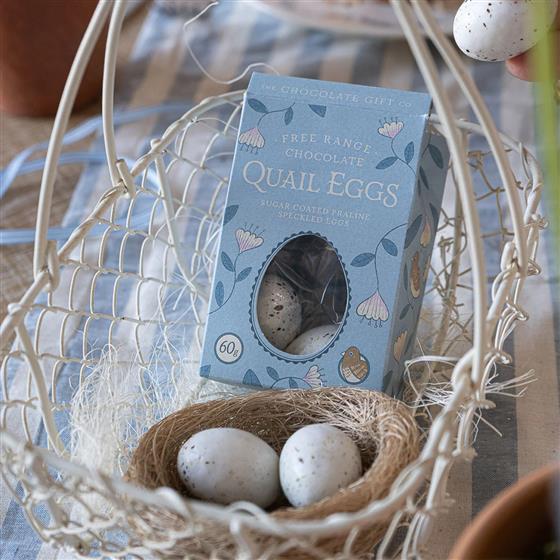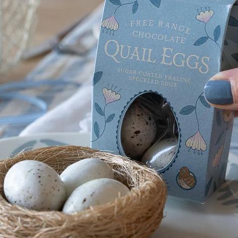 Nestled inside a beautiful illustrated pouch are a bundle of five quail eggs, made from delicious praline milk chocolate coated in a crunchy sugared shell.