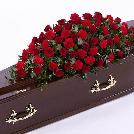 Large-headed red Rose combine with red carnations and luxurious foliages to create this traditional casket spray. Approximate height 92cm (3ft).