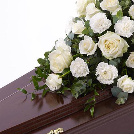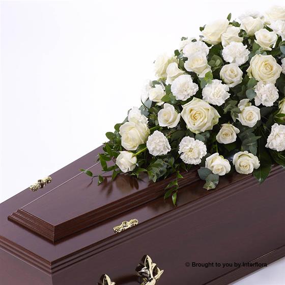 Large-headed white Rose combine with white carnations and luxurious foliages to create this traditional casket spray. Approximate height 92cm (3ft).