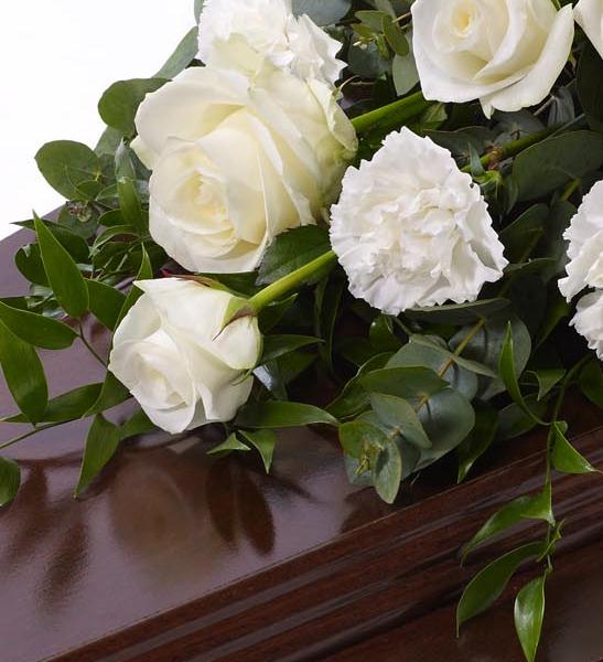 Large-headed white Rose combine with white carnations and luxurious foliages to create this traditional casket spray. Approximate height 153cm (5ft).