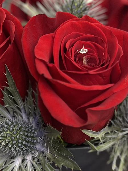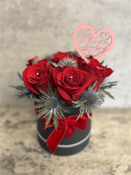 Red Rose arranged within a hatbox - finished with a velvet ribbon and wooden heart.