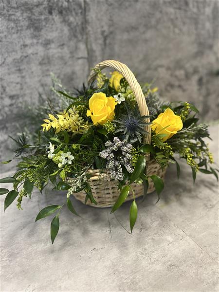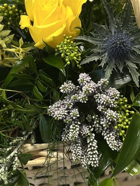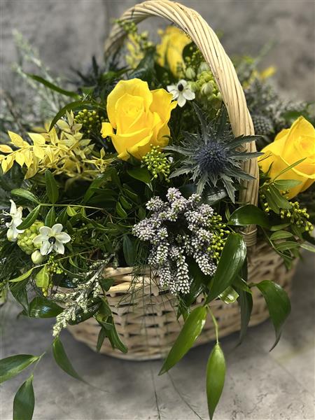 Yellow blues and purples, a gorgeous spring arrangement set in a sealed basket- just lovely!