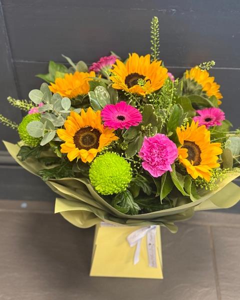 A bright and cheerful handtied bouquet including Sunflowers and Gerberas in water, presented in a box with added foliages and fillers.
