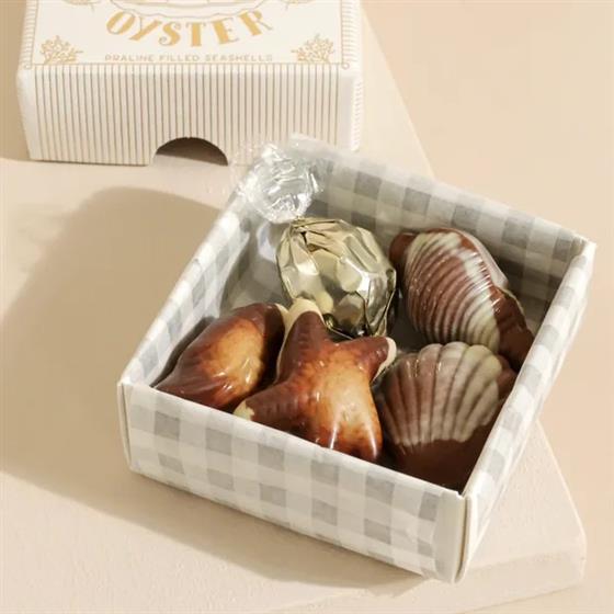 1 x Praline Mussel, milk chocolate filled with a crispy praline filling // 3 x Oysters, milk chocolate and filled with a caramel and praline ganache // 1 x Shimmering Oyster Pearl, milk chocolate with a crispy crepe and sea salt filling.